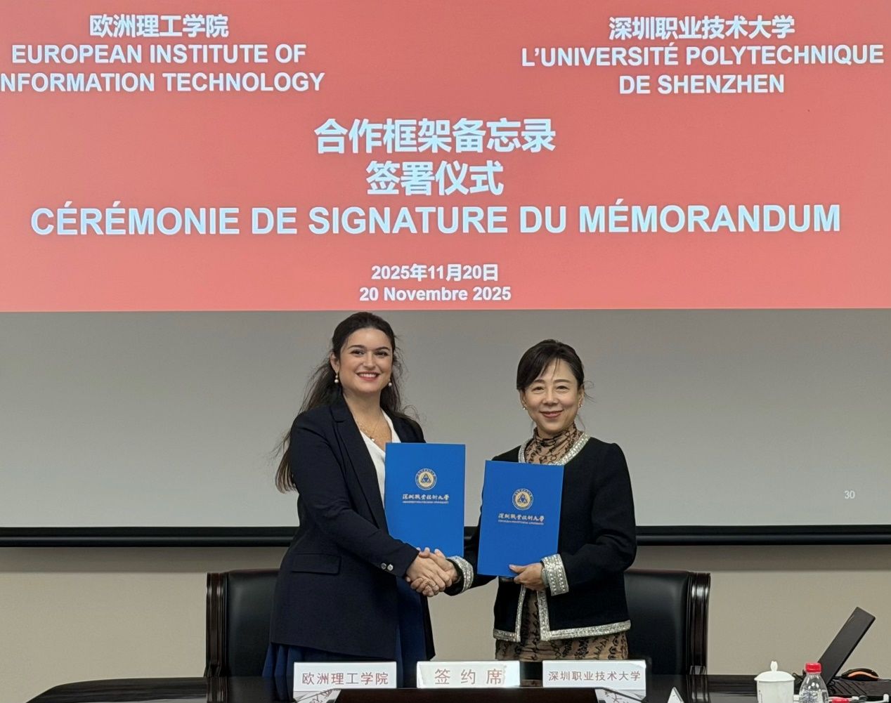 2025年11月20日上午,欧洲理工学院校长劳拉·哈桑女士、国际处处长雅尼克·特朗布莱先生和亚太及大洋洲区域经理卡米尔·图桑女士一行3人到访深圳职业技术大学。我校副校长李月、国际交流与合作处处长王冰峰,人工智能本科学院教师林伟鹏等5名校方代表在明德楼101会议室热情接待了来访嘉宾。